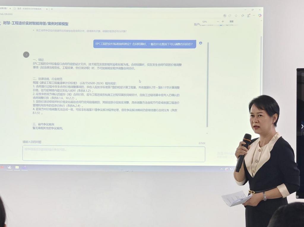 活動交流現(xiàn)場," 時慧 " 工程造價實時智能詢答與案例對策模型成為大家交流的焦點,技術(shù)人員現(xiàn)場演示了模型在造價爭議、上控編制、過程跟蹤、結(jié)算審核等方面中遇到問題時,向模型直接提問后," 時慧 " 快速給出答復(fù)并提供規(guī)范依據(jù)。該模型多場景的演示,令與會人員眼前一亮,實實在在感受到人工智能技術(shù)在咨詢領(lǐng)域場景中發(fā)揮的實際作用。